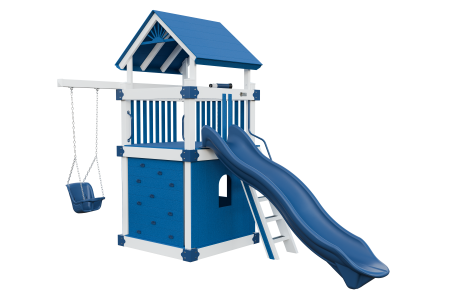 The Basecamp 55 Clubhouse is designed to offer a playhouse feel in a compact space. It features a spacious clubhouse with a roof, windows and doors, where kids can relax and enjoy the view. The playset also offers two ways to reach the upper deck: a challenging rock wall with grips or a sturdy ladder with handrails. From there, kids can zoom down the 10ft Avalanche slide and feel the thrill. The playset also includes two swings that can accommodate children of different ages.