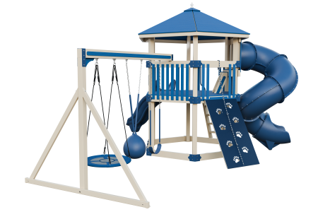 This hexagon tower playset is a spectacular addition to any backyard. It features a bear paw climber wall that leads to a spacious 5ft deck, where kids can enjoy the view and plan their next adventure. They can choose to slide down the thrilling 7ft turbo twister slide or the exciting 10ft Avalanche slide, both of which are designed for safety and fun. The playset also has a three-position swing beam that offers different options for swinging, such as a belt swing, a buoy ball, or a web swing. This playset is perfect for kids who love to climb, slide, and swing, and it will provide them with hours of outdoor entertainment.
