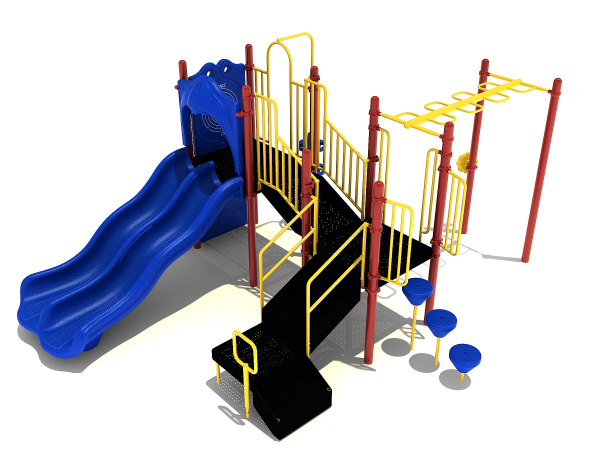 The Hudson Yards play structure is perfect for children between the ages of 5 and 12 years old. It is built hold a maximum of 24 to 28 children. It has a fall height of 7 feet, and its safety zone is 27’ 2” x 30’ 4”. This play structure comes in either a neutral color palette or a primary color palette. The neutral color palette consists of tan, brown, and green. The primary color palette consists of yellow, red, blue, and green. The Hudson Yards play structure has a pod climber, a pebble climber, a double wave slide, and an overhead snake ladder. It comes equipped with a maze panel, a bench panel, and a rain wheel.