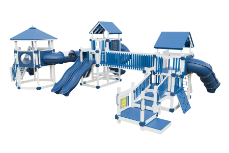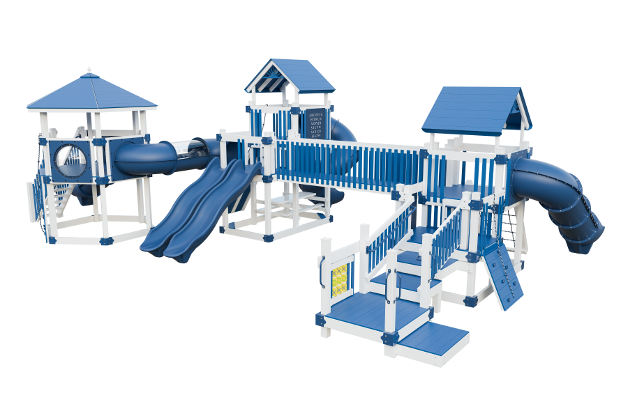 Playset Size: 45’W x 25’D x 14’H Space Needed: 60’ W x 40’ D Border Needed: 200’ Amount of Mulch: 16 Tons Amount of Kids: 20-22 Tower Size: (2) 5’ x 9’, 7.5’ x 7.5’ w/ (8) Metal “U” Bracket Upgrades, (5) 39” Commercial Height Railing Slides: 5’ Sidewinder, (2) 10’ Avalanche, 7’ Turbo Twister w/ Support Post, 5’ Angled Slide Swings: None Roof: Hexagon, (2) Poly Roof Swing Beam: None Fun Items: Bubble Panel, 5’ x 5’ Picnic Table, ABC/Sign Language Panel, Clock Panel, Tic Tac Toe Access/Climbers: ADA Platform First Step, ADA Transfer Station, 3’ x 3’ Rock Wall w/ Rope, 4’ x 5’ Commercial Cargo Net, 3’ x 7’ Rock Wall w/ Rope, 5’ Staircase, 5’ x 5’ Vertical Rock Wall, 9’-9” Bridge with Railings, S-Tunnel w/ Clear Section Ground Anchors: 8