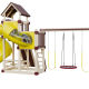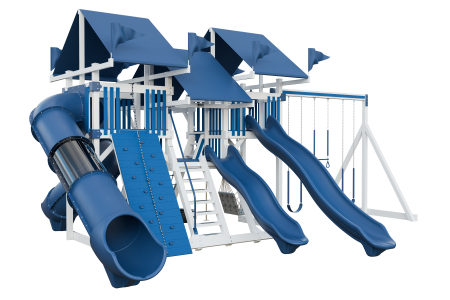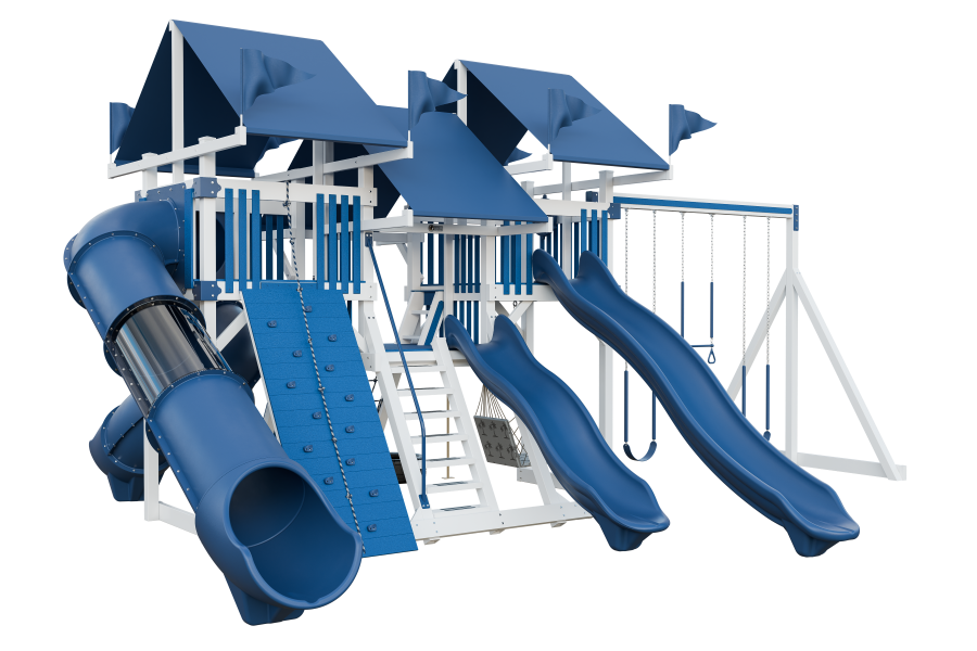 This is the ultimate climber playset and the biggest option in our Mountaineer Series. It features three towers with canvas roofs, one at 5′ and two at 7′ deck heights. Children can access the towers by climbing the 5′ ladder with safety rail, the 5′ or 7′ rock walls, or the cargo net. From the towers, they can choose to slide down one of the four exciting slides: the 10′ or 14′ avalanche slides, or the 7′ turbo twister or sidewinder slides. Some of the slides have clear sections for added fun. Under the towers, there is a tire swing and hammock swing plus a three position swing beam.