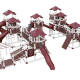 Playset Size: 106’ W x 80’ D x 18’ H Space Needed: 122’ W x 96’ D Border Needed: 436’ Amount of Mulch: 78 Tons Amount of Kids: 50-75 Tower Size: (3) 7.5’ x 7.5’, (4) 5’ x 9’, (5) 5’ x 5’, (2) Jungle Barw/ (27) Metal “U” Bracket Upgrades, (21) 39” Commercial Height Railing Slides: (2) 9’ Turbo Twister w/ Support Post, (2) 6’ Avalanche, 7’ Sidewinder w/ Support Post, (2) 14’ Avalanche,(2) 7’ Turbo Twister w/ Support Post, 3’ Tunnel Express,3’ Sidewinder, 10’ Avalanche, 5’ Angle w/ (2) Clear Sections Swings: None Roof: (3) Hexagon, (12) Poly Roof Swing Beam: 2 Position Monkey Bar 8’, ADA Monkey Bar 6’ Fun Items: (2) Tic Tac Toe, (2) ABC/Sign Language Panel, Clock Panel,(2) Fire Truck Panel, (2) Bubble Panel Access/Climbers: (4) ADA Platform First Step, (4) ADA Transfer Station, (2) 5’ Staircase, (2) 4’ x 5’ Commercial Cargo Net,(6) 16’ Bridge w/ Railings, (2) 6’-6” Tower Tunnel w/ (2) Clear Sections Each5’ Bear Paw Climber, 5’ Tower Mounting Ladder, Ground Anchors: 20