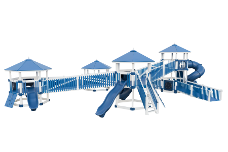 Playset Size: 55’ W x 36’ D x 15’ H Space Needed: 70’ W x 50’ D Border Needed: 240’ Amount of Mulch: 24 Tons Amount of Kids: 25-30 Tower Size: (4) 7.5’ x 7.5’ w/ (5) Metal “U” Bracket Upgrades, (4) 39” Commercial Height Railing Slides: 7’ Turbo Twister w/ Support Post, 5’ Turbo Twister, 10’ Avalanche, 3’ Tunnel Express, 14’ Avalanche, 6′ Avalanche Swings: None Roof: (4) Hexagon Swing Beam: None Fun Items: (2) Bubble Panel, Tic Tac Toe, Fire Truck Panel, Marble Wheel, Maze Panel Access/Climbers: (5) 16’ Ramps, 5’ Staircase, 3’ x 3’ Rock Wall w/ Rope,3’ x 5’ Rock Wall w/ Rope, 3’ x 7’ Rock Wall w/ Rope Ground Anchors: 10