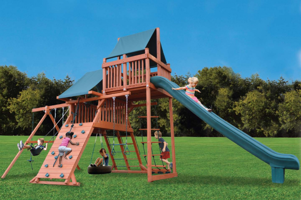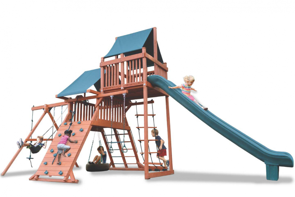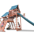 The Turbo Original Playcenter Sky Lounge Tower adds extra height and a super fun 15 foot slide. From learning to climb up the rock wall, to sliding down the slide, this playset is a great start! Made from super sturdy cedar construction, the Turbo Original Playcenter with added sky lounge is the perfect choice for the value minded family who demands the best! Larger timbers of 100% all natural premium Pacific Cedar (naturally resistant to insects and decay with fewer splinters than pine and North American timber), vinyl-dipped safety swing chains (protects fingers from pinching and insulates against extreme temperature), and rust-proofed hardware (DuPont Dacrometยฎ and galvanized are the best.) These are the fundamentals you will find in all Playground One play systems at PlayN Wisconsin.