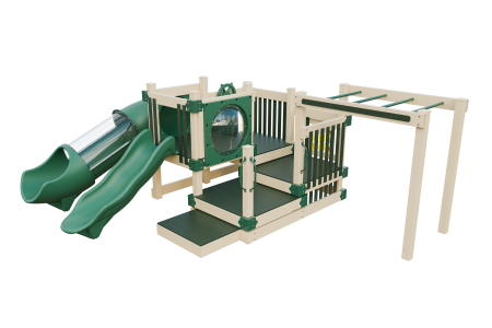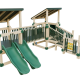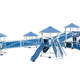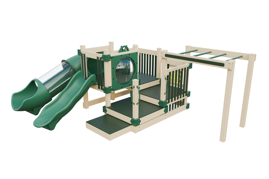 Playset Size: 16’ W x 13’ D x 6’ H Space Needed: 28’ W x 26’ D Border Needed: 108’ Amount of Mulch: 5 Tons Amount of Kids: 7-8 Tower Size: 8’ x 8’ Spiral w/ (4) Metal “U” Bracket Upgrades Slides: 6’ Avalanche, 3’ Sidewinder w/ Clear Section Swings: None Roof: None Swing Beam: None Fun Items: Ship’s Wheel, Bubble Panel, Tic Tac Toe Access/Climbers: ADA Monkey Bar 6’,ADA Platform First Step Ground Anchors: 4